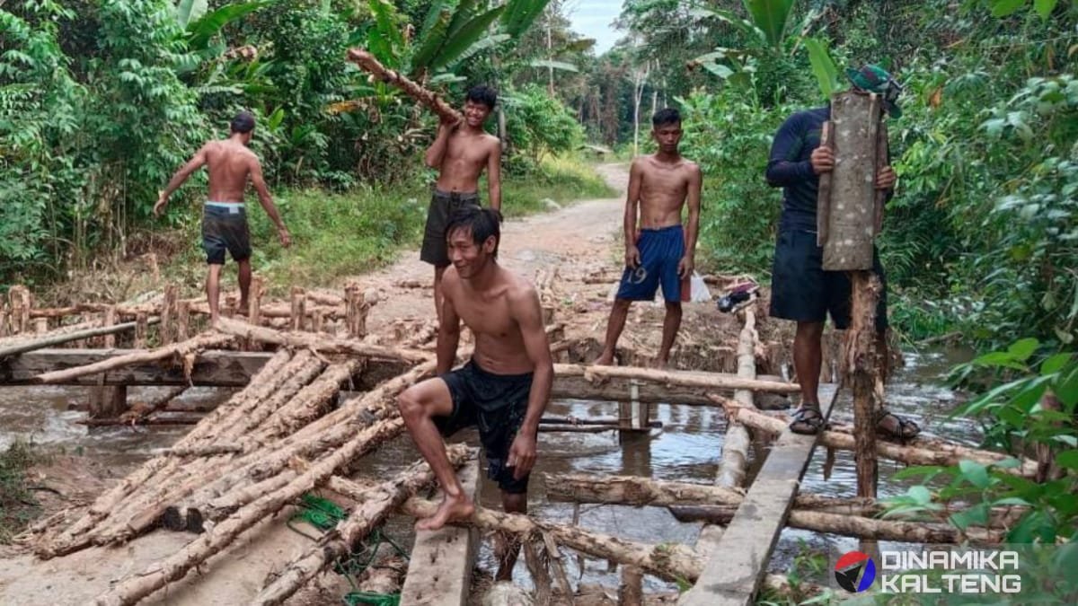 Sejumlah warga dan personel TNI bekerja bersama membangun jembatan penghubung antar desa (foto: DINAMIKA KALTENG/mas)