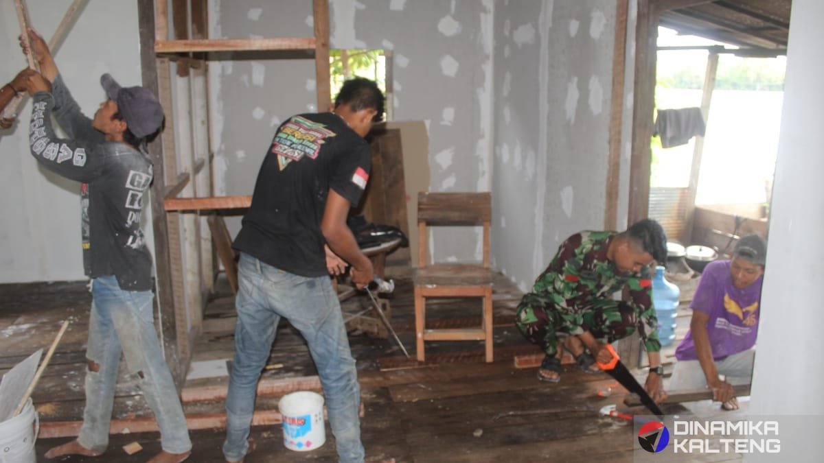 Personel Satgas TMMD Reguler ke-124 Kodim 1012/Buntok bersama warga tengah bekerja merenovasi rumah milik Bapak John Kennedy di Desa Talio (foto: DINAMIKA KALTENG/mas)