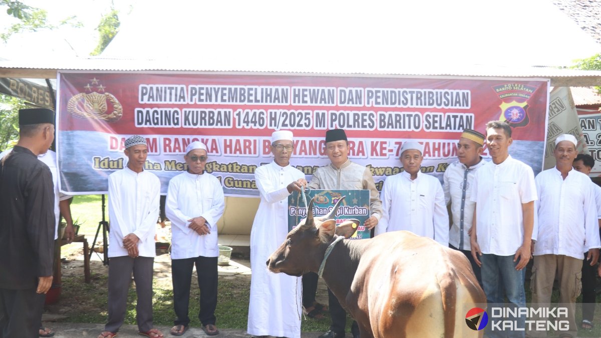 BUNTOK (Dinamika Kalteng) – Ketua Panitia Hari Besar Islam (PHBI) Kabupaten Barito Selatan, H. Akhmad Akmal Husaen, S.STP., MA, memberikan apresiasi setinggi-tingginya kepada Kapolres Barsel, AKBP Jecson R. Hutapea, S.I.K., M.H., atas bantuan satu ekor sapi kurban untuk warga Jalan Karau, Kelurahan Buntok Kota, Kecamatan Dusun Selatan, Jumat (6/6/2025).