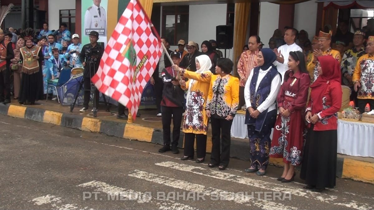 Barito Selatan – Ketua TP PKK Barito Selatan Hj Permanasari didampingi Pj Sekda Barsel Ita Minarni secara resmi melepas peserta pawai budaya dengan mengibarkan bendera start, Rabu (17/9/2025) pagi.