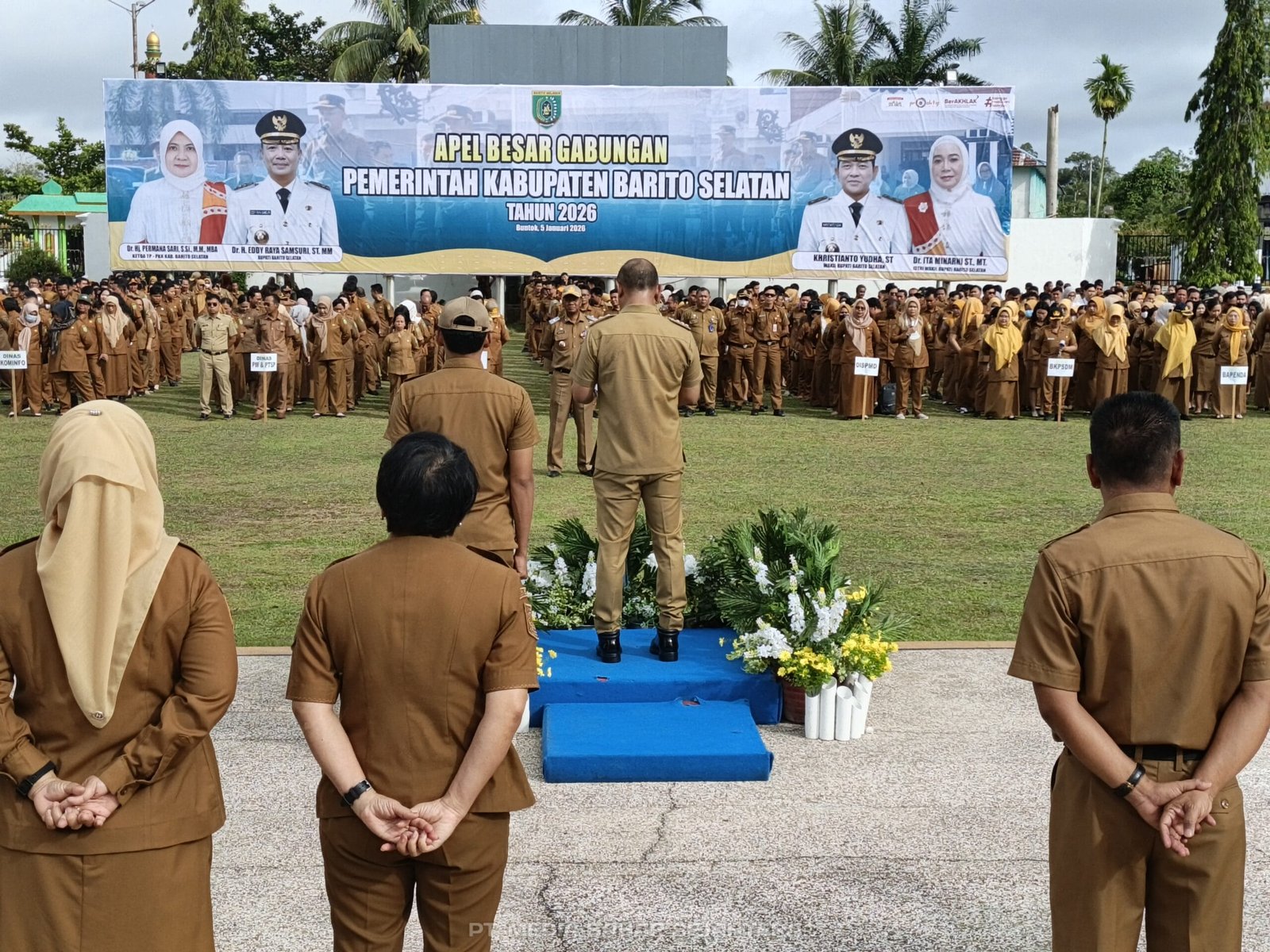 BARITO SELATAN – Setelah libur panjang Hari Raya Natal 25 Desember 2025 dan Tahun Baru 1 Januari 2026, Pemerintah Kabupaten Barito Selatan menggelar Apel Besar yang diikuti seluruh Aparatur Sipil Negara (ASN), bertempat di halaman Kantor Bupati Barito Selatan, Senin (5/1/2026).